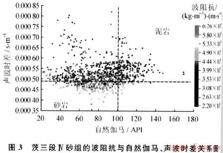 利用波阻抗反演結(jié)果來區(qū)分砂泥巖的巖性時要求二者的波阻抗要有較大差別,否則對于目的層段的含氣性預(yù)測具有不確定性,甚至得到錯誤的結(jié)果。因此,對工區(qū)內(nèi)8口探井目的層段的砂泥巖波阻抗特征進(jìn)行分析,其結(jié)果如圖3所示。可以看出:低自然伽馬及JIJ}聲波時差區(qū)域主要為高波阻抗分布區(qū),高自然伽馬及高聲波時差區(qū)域主要為低波阻抗分布區(qū)。這說明了砂巖以高波阻抗為主,泥巖以低波阻抗為主,可以應(yīng)用反演的波阻抗結(jié)果來判別砂泥巖,進(jìn)而進(jìn)行含氣性預(yù)測。
