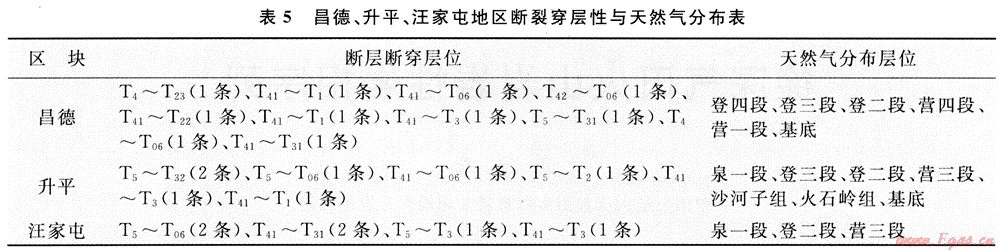 由表2中可以看出,徐家圍子斷陷以登二段為界下部主要發育的是從基巖或沙河子組或營城組斷至T32之下的斷裂,上部主要發育T32~T2、T31~T2、T3~T2的斷裂。斷裂的這一分布特征使得登二段以上蓋層被斷裂破壞程度小,使得其下天然氣大規模富集。然而,在升平、汪家屯和昌德地區局部發育有穿過登二段蓋層的斷裂,昌德地區有10條,升平地區有7條,汪家屯地區有9條(表5)。正是這些斷裂的溝通作用,使得登二段蓋層之下的部分天然氣在這些地區沿斷裂穿過登二段蓋層向上運移,聚集在登三、四段地層和泉一、二段地層中,形成升平、汪家屯和昌德上部氣藏。而其他地區因無此類斷裂,天然氣不能穿過登二段蓋層向上運移聚集成藏,只能在登二段蓋層之下聚集成藏。