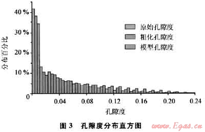 2) 統(tǒng)計(jì)特征對比。對比建立的孔隙度、滲透率、含氣飽和度等儲層參數(shù)的模型統(tǒng)計(jì)特征和輸入的原始測井解釋數(shù)據(jù)及其粗化后的數(shù)據(jù)(圖3),可以看出地質(zhì)模型儲層參數(shù)與原始數(shù)據(jù)的統(tǒng)計(jì)分布特征基本一致。