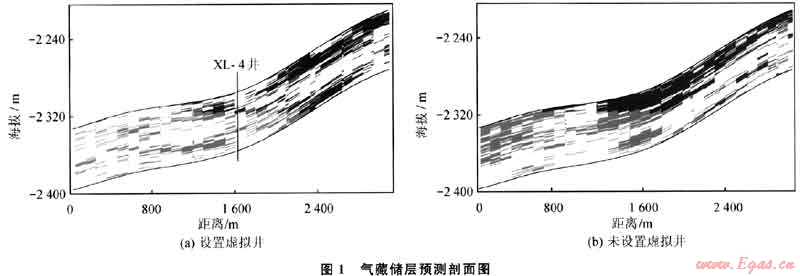 研究結(jié)果表明,根據(jù)地震資料結(jié)合鉆井及地質(zhì)綜合研究構(gòu)建合理“虛擬井”可以有效地解決氣藏邊部井網(wǎng)稀疏區(qū)域井間隨機(jī)性強(qiáng)的缺點(diǎn),能夠進(jìn)一步提高儲層地質(zhì)模型的精度。將采用和不采用“虛擬井”技術(shù)建立的儲層分布模型進(jìn)行對比可以看出,其儲層的發(fā)育程度和在空間上出現(xiàn)的位置具有很大的不同(圖1),表明僅依靠地震儲層反演成果約束建立的地質(zhì)模型在邊部井網(wǎng)稀疏的地方不能反映薄儲層在縱橫向上分布的特征。