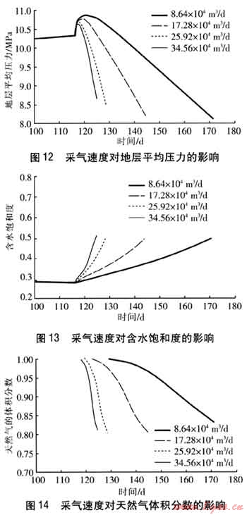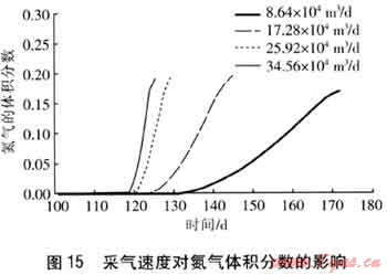 在目標(biāo)注氣量及注氣速度相同條件下,不同的采氣速度對(duì)儲(chǔ)氣庫(kù)運(yùn)行也有很大的影響(見圖12~15)。由圖12~15可知,采氣速度越快,地層平均壓力下降越快,注采井含水飽和度上升越快,天然氣與氮?dú)饣旌纤俣纫苍娇臁2蓺馑俣仍娇欤璧膲|層氣量越多,儲(chǔ)氣庫(kù)的回采率越低,而有時(shí)為了滿足調(diào)峰需要,可能需要較大的采氣速度。因此,必須綜合考慮各種因素,確定合理的采氣速度,保證調(diào)峰及采出氣體的質(zhì)量。