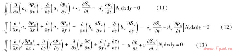 本文討論的是非穩(wěn)態(tài)的氣水滲流、氣氣擴(kuò)散問(wèn)題,各參數(shù)不僅是空間域的函數(shù),而且是時(shí)間域的函數(shù),因此建立有限元方程時(shí)采用部分離散的方法[7]。對(duì)空間域的離散采用Galerkin有限元方法,對(duì)時(shí)間域的離散采用有限差分法,把型函數(shù)僅表示成空間坐標(biāo)的函數(shù),而節(jié)點(diǎn)的函數(shù)值則是時(shí)間t的函數(shù)。G表示一個(gè)有界的可度量幾何形體,在此表示積分區(qū)域。當(dāng)G為平面有界閉區(qū)域時(shí),記為D;格林公式中,當(dāng)G為空間有限曲線段時(shí),記為Γ。