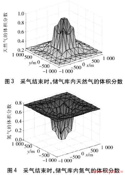 之后開始向儲(chǔ)氣庫(kù)注入天然氣,運(yùn)行到第116天時(shí),累積注入量(10022400m3)約達(dá)到目標(biāo)注氣量,停止注氣。天然氣注入結(jié)束時(shí),儲(chǔ)氣庫(kù)內(nèi)天然氣及氮?dú)獾捏w積分?jǐn)?shù)見圖1、2。由圖1、2可知,隨著天然氣的注入,天然氣逐漸將氮?dú)庀蛑車?qū)開,因而注采井周圍區(qū)域?yàn)榧兲烊粴鈪^(qū);由于氣體擴(kuò)散,天然氣與氮?dú)庀嗷交欤蚨鴱淖⒉删饾u向外,天然氣的體積分?jǐn)?shù)逐漸減小,氮?dú)獾捏w積分?jǐn)?shù)逐漸增大,形成天然氣與氮?dú)獾幕旌蠋В辉僦饾u向外,為純氮?dú)鈪^(qū)。
