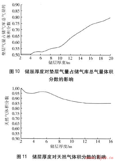 回采到第145天時(shí),儲(chǔ)層厚度對(duì)采出氣中天然氣體積分?jǐn)?shù)的影響見圖11。由圖11可知,對(duì)于注入相同量的天然氣與氮?dú)猓瑑?chǔ)層厚度越大,兩種氣體混合的程度越大,從氣體混合角度分析,儲(chǔ)層厚度應(yīng)該越小越好,但儲(chǔ)層厚度越小,儲(chǔ)氣量越低。因此,應(yīng)當(dāng)綜合考慮多種因素,選取合適厚度的儲(chǔ)層。從圖11也可以看出,在儲(chǔ)層厚度為4~6m時(shí),采出氣中天然氣的體積分?jǐn)?shù)出現(xiàn)一個(gè)峰值,這就涉及到一個(gè)最佳儲(chǔ)層厚度的問(wèn)題,既要保證天然氣與氮?dú)獾幕旌铣潭炔挥绊懱烊粴獾氖褂茫忠WC儲(chǔ)氣庫(kù)的儲(chǔ)氣量。
