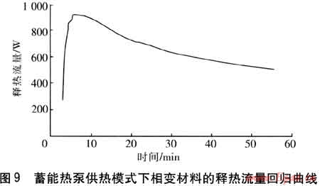 將圖8中的Φc與P相減,得到蓄能熱泵供熱模式下相變材料的釋熱流量,回歸曲線見圖9。由于前2min實驗數據不穩定且存在Φc<P的情況,因此曲線從第2min給出。與圖7比較,在蓄能熱泵供熱模式運行56min后,制冷系統取走了儲存在相變材料中94.6%的熱量。