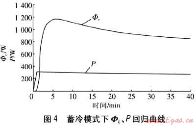 由實驗結果擬合的蓄冷模式下Φc、P回歸曲線見圖4。由圖4可知,在壓縮機開機的第1min,由于制冷循環剛開始,而且換熱過程也需要消耗時間,因此換熱器進出水溫度相差不大,Φc也很小。在運行過程中P隨著冷凝壓力、蒸發壓力的下降而逐漸降低。