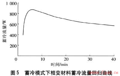 Φc與P之差即為相變材料蓄冷流量(回歸曲線見圖5),由于前2min實驗數據不穩定且存在Φc<P的情況,因此曲線從第2min給出。隨著運行時間的推移,壓縮機逐漸穩定運行,制冷劑與相變材料的換熱流量不斷增大,初期提取的熱量為液態相變材料的液相顯熱,當相變材料溫度進入相變區間時,制冷劑取出的熱量為相變潛熱。