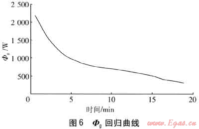 在蓄冷完成后,壓縮機停機,立即開始取冷實驗。由實驗結果擬合的Φg回歸曲線見圖6。由圖6可知,取冷實驗持續時間為19min,在5~11min,Φg的變化相對前后兩個時間段要平緩,因此這一時段相變材料處于相變釋冷階段。在19min后,由于相變材料與熱水的溫差較小,因此釋冷緩慢,此時取冷量已經達到蓄冷量的90%??紤]到取冷時間較短,以及存在熱損失等因素影響,因此可以基本認定:三套管相變蓄能換熱器在蓄釋能過程中能量是基本守恒的。