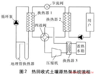 熱回收式土壤源熱泵是為了解決土壤取排熱不平衡提出的技術,系統流程見圖2。在壓縮機出口增加換熱器3,無論冬夏季都可以提供生活熱水。夏季,壓縮機出口的高溫高壓制冷劑蒸氣,先經過換熱器3與蓄熱水箱換熱,再經過四通閥進入換熱器1,通過地埋管換熱器把熱量排放到土壤中,這樣可適當降低夏季向土壤的排熱量。冬季,地埋管換熱器從土壤中獲得的熱量同時滿足供暖和生活熱水要求。熱回收式土壤源熱泵在夏季可減少向土壤的排熱量,冬季增加從土壤中提取的熱量,實現全年土壤取排熱的基本平衡。