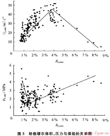 2) 華北地區石炭 二疊系各煤類朗格繆爾體積與煤級的關系呈現出兩段式變化模式,即煤化程度在Ro,max<4%之前,VL,daf隨Ro,max的增加而增大,當Ro,max>4%后,VL,daf隨Ro,max的增加而減少;朗格繆爾壓力與煤級關系復雜,數據十分離散。