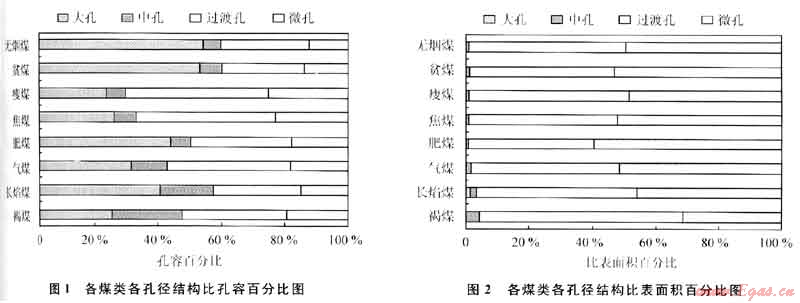 各煤類各孔徑結構中比表面積微孔、過渡孔占絕對多數(圖2、表2),成為煤層氣吸附的主要場所,大孔均低于0.82%,中孔除褐煤達到6.49%,長焰煤達到2.07%外,其他均低于0.82%(圖2、表2)。
