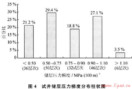 其中,嚴重欠壓儲層(儲層壓力梯度小于0.5MPa/100m)占21.2%,欠壓儲層(儲層壓力梯度介于0.5~0.75MPa/100m)占29.4%,略欠壓儲層(儲層壓力梯度介于0.75~0.90 MPa/100m)占18.8%,正常壓力儲層(儲層壓力梯度介于0.90~1.10MPa/100m)占27.1%,超壓儲層(儲層壓力梯度大于1.10MPa/100m)占3.5%(圖4)。儲層壓力梯度總體隨埋深的增加呈現出增大的趨勢(圖5)。