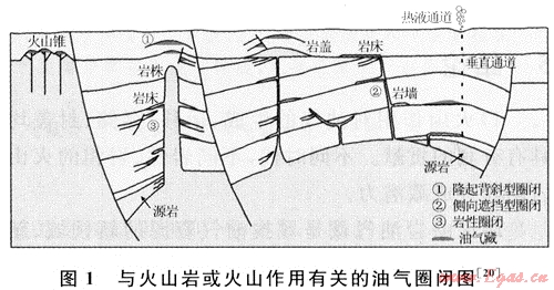 火山作用對油氣圈閉形成的影響可分為兩類:①火山巖或侵入巖直接作為儲集層,形成構造或巖性圈閉;②火成巖與沉積巖相互配置,形成側向遮擋型、披蓋背斜型和局部蓋層型等圈閉。