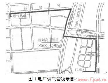 由于城市門(mén)站直線(xiàn)距離電廠(chǎng)不足3kin,管線(xiàn)距離僅4.5km,為此電廠(chǎng)所需天然氣從市門(mén)站接出,并用專(zhuān)線(xiàn)直供電廠(chǎng)。考慮到電廠(chǎng)二期擴(kuò)建及減少啟停和事故狀態(tài)下對(duì)天然氣管網(wǎng)的沖擊,管徑選擇為DN600。但是目前的城市門(mén)站只能滿(mǎn)足電廠(chǎng)一期工程的需要,為此一期供氣工程利用現(xiàn)狀高壓系統(tǒng),在現(xiàn)狀進(jìn)站總管設(shè)置三通后,經(jīng)計(jì)量(成撬設(shè)置)后直供電廠(chǎng)。同