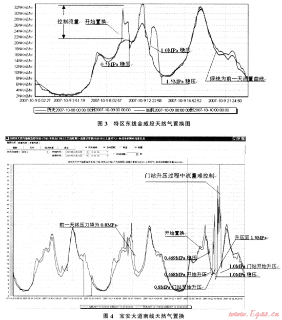 (3) 按有關(guān)規(guī)范的要求,置換時的流速應(yīng)控制在5m/s。通過粗略計算將流速控制折算成流量控制,建立流量控制表,通過SCADA系統(tǒng)門站瞬時流量,結(jié)合前一天的流量曲線,算出增量,將增量與流量控制表對比,及時通知現(xiàn)場進氣閥門操作人員進行調(diào)整。將流量控制在規(guī)范范圍。同時也保證了流量較為平穩(wěn),將對上游的影響降到最低。