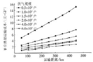 ?、?LNG供氣經濟性良好,供氣成本在2.15~2.77元/m3內變化。但對于15×1O4戶以下的供氣規模不適合遠距離運輸,因為隨著運輸距離的增加,這些規模的供氣成本增加較大。
