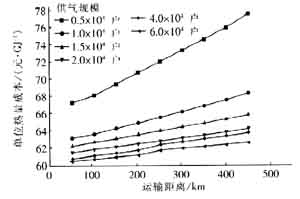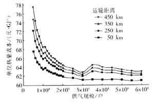 圖6 單位熱量運輸成本隨供氣規模的變化曲線