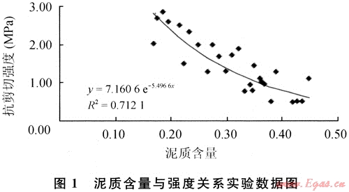 巖石抗剪切強度主要取決于泥質含量與含水飽和度。根據參考文獻發表的實驗數據,對單因素進行實驗數據分析,樣品的抗剪切強度與泥質含量(含水飽和度20%)的回歸關系式為(圖1):