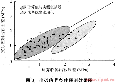 從圖3可以看出,25%的井的臨界壓差計算結果與實際出砂壓差偏差較大,分析其原因,這些井的實際生產壓差都較高,出水較多。氣井在開采過程中的出水將導致地層強度減弱,降低出砂的臨界壓差,使地層更容易出砂。