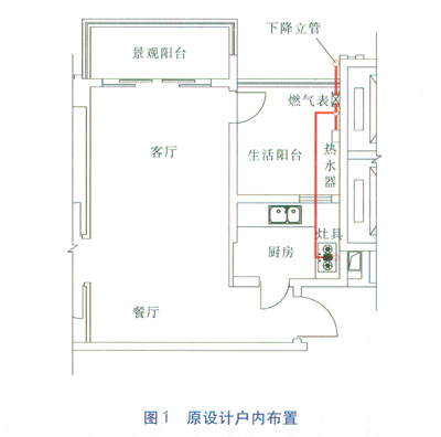 某樓盤所有戶型都是房地產(chǎn)精裝修,一些戶型的廚房位于進(jìn)戶大門旁,廚房的窗口外面是敞開式生活陽臺(tái),客廳和餐廳左側(cè)是兩房間,燃?xì)饬⒐馨惭b在敞開式生活陽臺(tái)外側(cè),燃?xì)獗砗蜔崴饕差A(yù)先安裝在敞開式生活陽臺(tái)上,燃?xì)獗砬叭細(xì)夤艿兰芸辗笤O(shè)在敞開式生活陽臺(tái)的墻上,表后管道采用銅管直埋于墻壁,并沿墻壁下來直接進(jìn)入地板內(nèi)敷設(shè),從而連接熱水器和燃?xì)庠睢_@種布置方式是符合規(guī)范要求的。原設(shè)計(jì)戶內(nèi)布置見圖1。