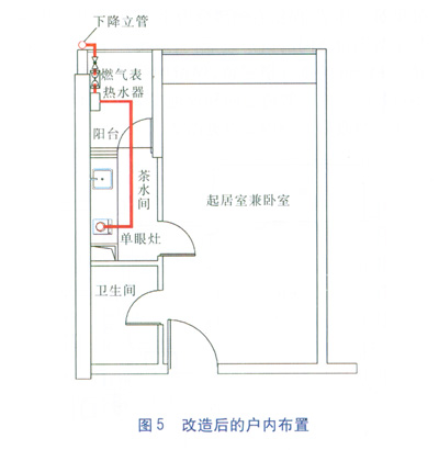 由于業(yè)主強(qiáng)烈要求不僅熱水器要供燃?xì)猓杷g內(nèi)的單眼灶也需要用燃?xì)狻R虼耍覀兛紤]了規(guī)范的要求,茶水間作為廚房用時(shí),在茶水間與起居室兼臥室間增設(shè)實(shí)體墻和門,使茶水間與起居室得到有效隔離,并要求業(yè)主選用帶有自動(dòng)熄火保護(hù)裝置的燃?xì)庠睿@樣就滿足用氣條件。燃?xì)獗砗笕細(xì)夤艿揽梢圆捎勉~管直埋于墻壁,并分兩路,一路在墻壁敷設(shè)引進(jìn)熱水器,另一路沿墻壁下來直接進(jìn)入地板內(nèi)敷設(shè),從而連接單眼灶。這樣熱水器和單眼灶都能使用燃?xì)狻8脑旌蟮膽魞?nèi)布置見圖5。