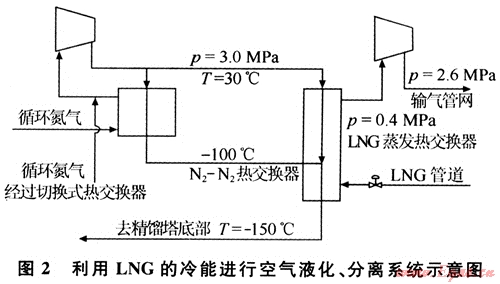 華東地區由于經濟發展的需要,所需液氮、液氧、液氬數額巨大,盡管滬寧一帶空分液體設備眾多,但仍出現供應緊張的情況。由于氧氮沸點分別為-183℃和-196℃,空氣液化所需溫度較低。隨著溫度降低其消耗的電能將急劇增加,要求的功將快速增加,機械效率將很低。因此選擇利用LNG冷能的工藝過程應充分利用其-160℃的低溫。LNG冷能的利用建議首選空氣分離和液化。