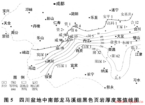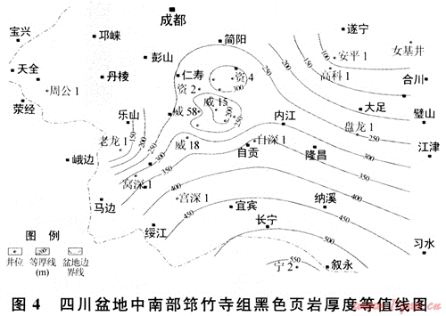 下古生界黑色頁巖集中分布在下寒武統筇竹寺組、下奧陶統大灣組和五峰組及下志留統龍馬溪組等4個層段中。大灣組(或大乘寺組)黑色頁巖在盆地西南部較發育,其厚度一般在45~140m,特別是在威遠地區分布穩定,也是未來下古生界頁巖氣勘探值得重視的一套目的層。五峰組黑色頁巖雖分布穩定,但厚度較薄,一般只有幾米,且與龍馬溪組整合接觸,特征類似。限于資料,筆者僅針對筇竹寺組和龍馬溪組兩套黑色頁巖開展分析與討論。