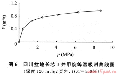 圖6為長芯1井120m處所取巖心的等溫吸附曲線(70℃等溫),該樣品為志留系龍馬溪組黑色頁巖,有機碳含量為5.9%,成熟度為3.26%。在70℃等溫條件下,隨著壓力增高,頁巖吸附甲烷的能力(V)逐漸增大,在壓力達到8.5MPa時,頁巖的甲烷吸附能力達到1m3/t。通過與美國5大頁巖氣盆地的頁巖等溫吸附曲線對比可以發(fā)現(xiàn),長芯1井志留系頁巖的吸附能力除與圣胡安盆地白堊系Lewis頁巖相近外,均低于其他盆地的頁巖。究其原因,筆者認為很可能與成熟度有關(guān)。目前發(fā)現(xiàn)的進行商業(yè)開發(fā)的美國5大頁巖氣盆地的頁巖,成熟度普遍不高,介于0.4%~1.9%之間。而熱成因的頁巖氣藏,頁巖成熟度較高,大多在1.1%以上,最高不超過3%。四川盆地長芯1井志留系頁巖的成熟度過高,Ro達到了3.26%,已進入過成熟階段,這可能是導(dǎo)致其吸附能力較低的主要原因。另仔細分析可以發(fā)現(xiàn),美國5大頁巖氣盆地中圣胡安盆地白堊系Lewis頁巖的成熟度最高,為1.6%~1.88%,其頁巖的吸附能力則最小。