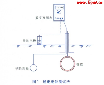 城鎮燃氣管道多為埋地敷設,由于土壤中含有水分、空氣、酸、堿、水溶性礦物鹽以及微生物,這些因素都會使金屬管道發生腐蝕。金屬腐蝕直接和間接造成了巨大的經濟損失,因此,必須采取有效的防腐措施,實踐證明控制管道腐蝕的主要方法是采用防腐層和陰極保護。對金屬管道的陰極保護進行測試和評價,可以及時發現管道腐蝕和安全隱患,最大程度降低經濟損失。采用犧牲陽極和3PE防腐層聯合保護的次高壓燃氣管道,通常采用通電電位測試法和斷電電位測試法進行陰極保護測試。