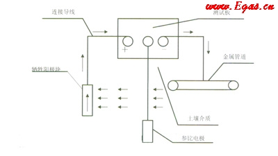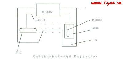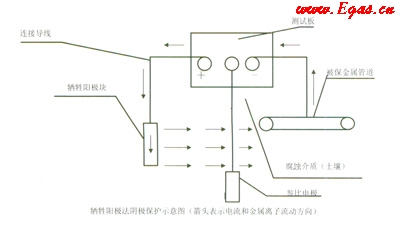 陽極開路電位是指犧牲陽極與管道連接線斷開時,用數字萬用表測出的陽極電位,它應比管道保護電位低,與對管道進行陰極極化,進行陰極保護。其原理是:管道(陰極區)和犧牲陽極塊(陽極區)組成一個腐蝕微電池,進行氧化還原反應(電解化學腐蝕),使陽極塊金屬材料破壞,直接產生陽極反應一一氧化反應;另一端的管道進行陰極反應,不斷獲得由陽極經過電解液(土壤)而流入的電子被還原得到保護。同時,陽極和管道的距離在0.3~0.7米范圍內,對保護電位影響不大。見示意圖:
