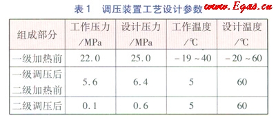 壓縮天然氣氣瓶車在母站充裝壓縮天然氣后通過公路運輸進入CNG儲配站,通過專用高壓軟管與卸氣柱相連,氣瓶車內的壓縮天然氣經調壓裝置調壓后送入燃氣管網供用戶使用。具體過程為:進口壓力約22MPa的壓縮天然氣經過裝置入口高壓球閥、過濾器、緊急切斷閥后,在一級加熱裝置進行加熱,加熱后的壓縮天然氣經過一級調壓設備,壓力降為5.6MPa,然后進入二級加熱裝置,加熱后的天然氣再經過二級調壓設備,壓力降為0.1MPa,進入城鎮中壓管網。調壓裝置工藝設計參數見表1。