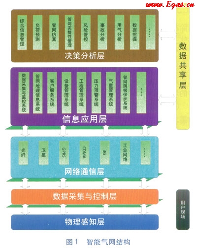 智能氣網涵蓋了天然氣生產、儲存、輸配和終端用戶使用的全過程。智能氣網通過傳感器把管網各種設備、生產工藝參數、資產聯系在一起,形成一個完整的數據流和信息流,通過對數據信息進行整合、分析和挖掘,以此來降低運行成本,提高整個氣網的安全性以及優化運營管理流程。