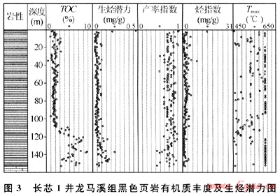 對上揚子地區下志留統龍馬溪組有機碳含量統計,發現下志留統龍馬溪組有機碳含量變化大,分布在0.1%~8.65%之間,多數大于1%。長寧-珙縣地區鉆探的長芯1井,通過對龍馬溪組下部黑色頁巖153m連續取心的有機碳含量分析(圖3)同樣反映出這種變化特征。在110m以淺,TOC含量處在1%~3%之間,平均為2%,110~153m井段(龍馬溪組最底部)TOC均大于2%,平均值可達到6%。全井段統計,TOC>2.0%的累計厚度可達80m,主要分布于龍馬溪組下段(包括上奧陶統約10m的五峰組碳質頁巖),這將是形成頁巖氣藏最有利層段。