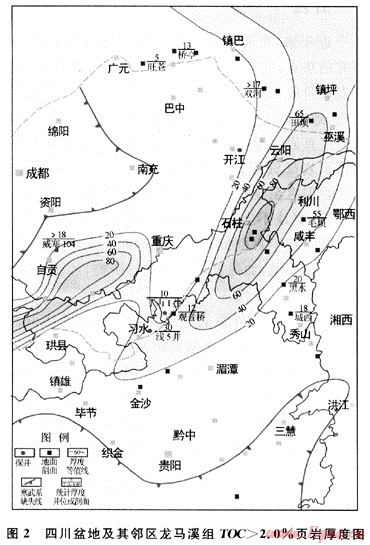 基于TOC含量是頁巖氣藏形成最基本的地質要素觀點,編制的TOC>2.0%的黑色頁巖累計厚度等值圖說明了以下幾點:①川東石柱-鄂西利川、川南瀘州和川北鎮巴地帶是四川盆地下志留統龍馬溪組海相頁巖最發育,也是頁巖氣藏形成最有利分布區;②四川盆地及其鄰區下志留統龍馬溪組海相頁巖有機質豐度分布高值區(即優質源巖發育區)明顯受控于海灣深水陸棚沉積相體系,表明有利沉積相帶控制優質烴源巖韻發育。