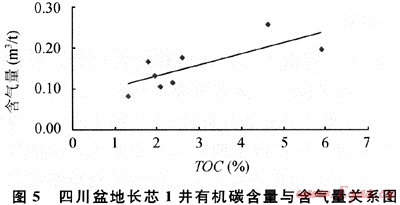 頁巖氣的勘探生產價值取決于其中游離氣和吸附氣的含量,游離氣的含量高低與其構造保存條件密切相關,而吸附氣含量受溫度、壓力等環境因素影響,在相同情況下,吸附氣量高低與有機質含量呈正相關。上揚子地區志留系烴源巖有機質豐度高,預計將會在構造保存條件差異較大的地區分別形成不同含氣量及含氣特點的頁巖氣聚集。在四川盆地,除已發現過去的老井在鉆探志留系頁巖段時具有豐富的氣顯示之外,目前完鉆的長芯1井初步分析結果顯示,在埋深淺于150 122龍馬溪組頁巖層段內,同樣發現了頁巖氣存在的證據(表2)。8個頁巖巖心的含氣量實驗結果顯示(解析溫度70℃),每噸巖石含氣量為0.08~0.25m3,平均為0.15m3/t。另從110m和120m巖樣的甲烷碳同位素分別為-40.2‰和-52.3‰來看,頁巖氣應為熱成因的天然氣。有機質豐度與含氣量的關系則顯示(圖5),同美國頁巖一樣,同樣具有有機碳含量與含氣量呈正相關的關系,即有機質豐度越高,含氣量越大。