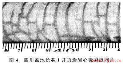 上揚子地區除四川盆地外,其余地區勘探程度非常低,且無論是四川盆地還是四川盆地以外的探區,已往的油氣勘探實踐中,都沒有把頁巖地層當做有效目的儲層對待。因此,開展頁巖儲層的研究甚少[3~4]。四川盆地長寧構造所鉆的長芯1井8個志留系頁巖樣品的巖礦組成分析結果見表1。長寧構造龍馬溪組頁巖巖礦組成中,黏土最多,含量為26.5%~59.5%,平均48.25%,其次是石英,含量為20.5%~29.7%,平均25.3%,方解石含量為4.1%~26.9%,平均12.4%。與美國已知含氣頁巖相比,該井硅質(石英)含量偏少,而黏土(伊利石為主)含量偏高,根據美國經驗,這似乎對頁巖儲層的脆性有影響。但仔細分析發現,該井的方解石總量較高,石英和方解石總量達37%,表明該套頁巖具有脆性巖石組分。野外剖面可見風化破碎的龍馬溪組筆石頁巖,且在露頭和長芯1井巖心上均可發現頁巖高角度縫和微裂縫十分發育(圖4),揭示了該區頁巖具有良好的脆性特征。