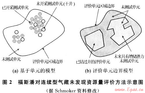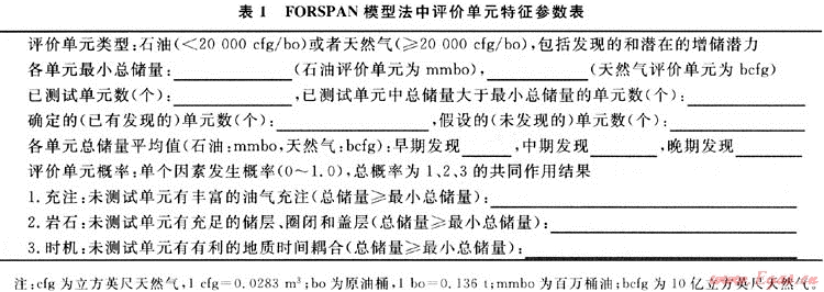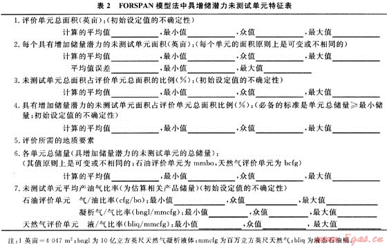福斯潘模型(FORSPAN)法是USGS在1999年為連續型油氣藏資源評價而提出的一種評價方法。該方法以連續型油氣藏的每一個含油氣單位為對象進行資源評價,即假設每個單元都有油氣生產能力,但各單元間汗油氣性(包括經濟性)可以相差很大,以概率形式對每個單元的資源潛力作出預測。以往也用體積法對連續型油氣藏資源潛力作過評價。在體積法中,原始資源量估算常用的參數主要是一些基本地質參數(如面積、厚度、孔隙度等),這些參數有很大的不確定性,且各單元間關系密切、缺乏獨立性。因此,參數選取及標準確定較困難。福斯潘(FORSPAN)法建立在已有開發數據基礎上(圖2),估算結果為未開發原始資源量。因此,該方法適合于已開發單元的剩余資源潛力預測。已有的鉆井資料主要用于儲層參數(如厚度、含水飽和度、孔隙度、滲透率)的綜合模擬、權重系數的確定、最終儲量和采收率的估算。如果缺乏足夠的鉆井和生產數據,評價可依賴各參數的類比取值。