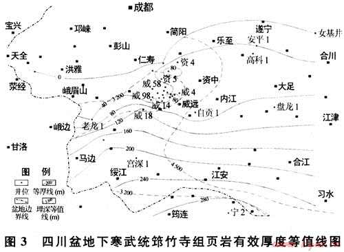 頁巖厚度的確定是頁巖氣資源評價的基礎,方法是根據沉積環境、巖性特征、結構組成等因素,將目的層中黑色頁巖劃分出來,單獨進行統計。首先根據區域地質、地震、鉆井等資料分析四川盆地下寒武統筇竹寺組頁巖系統的區域展布規律,確定和劃分頁巖系統,對頁巖系統中的黑色頁巖、碳質頁巖、黑灰色粉砂質和砂質頁巖統計成圖。其次,在此基礎上,依據有機碳含量、熱成熟度、鉆井氣顯示等特征,確定有效頁巖厚度(圖3)。四川盆地西南部地區筇竹寺組有效頁巖面積約55828km2,有效厚度20~300m,盆地南部邊界寧2井區厚度最大(約450m)。為便于頁巖氣資源估算后的進一步經濟評價,對不同埋深下的有效頁巖面積做了統計,埋深大于4500m的有效頁巖面積為27425km2,埋深4500~3200m的有效頁巖面積20684.2km2;埋深小于3200m的有效頁巖面積7718.8km2。