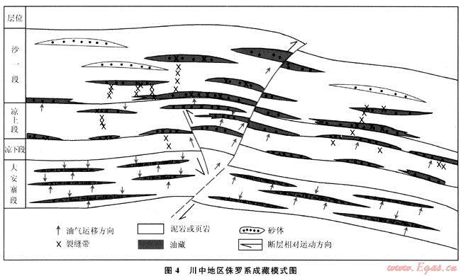 總之,除在龍門山?jīng)_斷帶、大巴山?jīng)_斷帶及華鎣山?jīng)_斷帶上升盤中生代和古生代地層遭到強烈剝蝕不具備封蓋和保存條件,逆沖大斷裂下降盤侏羅系地層上傾方向與具壓性特點的斷裂相接,可構成構造-巖性圈閉以外,盆內(nèi)大部分地區(qū)都主要以巖性圈閉、構造(裂縫)-巖性圈閉為主(圖3)。油氣橫向運移受到制約,斷裂及其伴生裂縫成為油氣就近運移、就近捕獲的重要通道或載體,裂縫有利于油氣的富集。