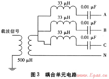 圖2中耦合單元電路見圖3。這個電路實際上是通過一個電感為500μH、匝數比為1:1的高頻耦合變壓器完成數據從載波通信芯片到電力線或電力線到載波通信芯片之間的傳遞。同時它還保證了電力線和通信電路之間強電和弱電的電氣隔離。在耦合變壓器前分別用三組帶通濾波器直接連接到電力線的A、B、C三相上。耦合變壓器的另一個輸出端直接和電力線的零線連接。濾波器的電感為33μH,電容為0.01μF。電感和電容串聯在270kHz的電路時構成串聯諧振。對載波信號來說,它的阻抗幾乎為0,但對于工頻的信號阻抗很大。因此,這個電路能強烈抑制工頻信號的干擾,但能讓載波信號順利通過。
