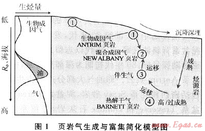 頁巖氣生烴過程與常規油氣并無區別,但儲集方式、富集條件以及氣藏宏觀分布差異較大。從天然氣賦存狀態來看,頁巖氣包含了吸附氣部分,并且不同地質條件下游離氣、吸附氣二者相對含量變化大,開采方案、生產曲線也呈現不同特征;從油氣成藏動力條件以及宏觀特征上看,常規油氣運移過程中需要上傾方向存在與輸導體系相關的構造高部位,離散分布的低勢能區域是成藏有利目標,浮力是天然氣運移的主要動力,天然氣不斷運聚,氣水界面隨之下移,所以下傾方向往往是水層,而連續式富集的頁巖氣鮮受水動力影響,多區域性分布于坳陷中[12],如Appalachian、Michigan和Illinois盆地泥盆系含氣頁巖覆蓋面積約71200km2,屬于自生自儲巖性氣藏,沒有明顯的氣水界面。