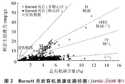 需要注意:初始有機質豐度較高的烴源巖,隨著熱演化程度加深,生烴量增加,殘余有機碳豐度、氫指數、有機質類型呈現降低、變差趨勢,如Tmax(最大熱解溫度)432℃、等效成熟度0.62%,Barnett頁巖演化至Tmax為470℃,等效成熟度為1.3%時,TOC數值可降低36%(圖2),對于高成熟和/或過成熟烴源巖,負面影響則更大,所以簡單套用殘余有機碳豐度、氫指數或于酪根類型判斷頁巖生氣能力的高低可能有失偏頗。但儲集能力而言,殘余有機質豐度常可表征含氣量大小,特別是當兩者呈現正相關情況下。北美頁巖氣勘探目標絕大多數選擇TOC含量大于2%,甚至4%以上,與此有關聯。因此資源潛力評價過程中應綜合考量有機質豐度指標,既要重視源巖原始有機質豐度與生烴潛力,又要關注頁巖儲層殘余總有機碳含量的作用。