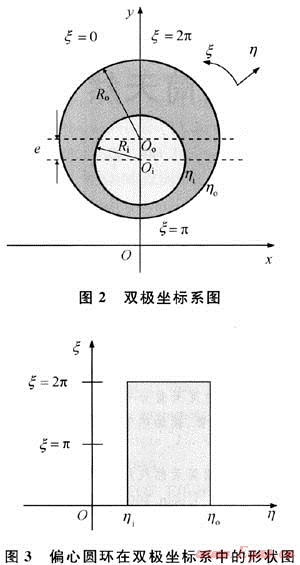 在直角坐標系中,偏心圓的幾何形狀是不規則的,為了使邊界條件簡化,引入雙極坐標系;ξ和η為雙極坐標系的坐標分量,η從-∞到+∞;ξ從0到2π,可以覆蓋全平面;e為偏心距,即兩圓圓心的距離[5~6],如圖2所示。