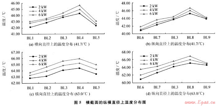 測試結果由圖5所示,在不同的加熱功率下,橫軸上測點BL4的溫度最高,縱軸上測點BL8的溫度最高,因為這兩個測點離火筒位置最近,而火筒是模擬煙氣的入口,氣流溫度最高,測點BL3至BL4的溫度變化幅度在中間載熱介質水溫為41.7℃時比為63℃時大,其原因是介質水溫較低時,與火筒內的氣流溫差較大,使火筒壁面附近對流換熱加大,介質水溫上升快,因此火筒周圍形成了較強的上升流;而介質水溫為63℃時,由于介質與氣流間的溫差較小,對流換熱相對弱,上升流的動力也小。縱軸上各測點溫度顯示:在不同的加熱功率和中間載熱介質溫度下,溫度分層現象明顯,測點BL8溫度最高,自BL3、BL7至BL6依次降低,而BL9比BL8低,但高于其他測點,這與流場換熱狀況相吻合;測點BL6的溫度,在加熱功率較小時,會低于介質溫度,表明在此附近區域加熱氣流提供的熱量不足,被加熱氣流只能吸收中間載熱介質的初始熱量達到升溫的目的。試驗結果證實了數值計算反映的大圓筒中間載熱介質天然氣加熱爐流場中存在的問題。