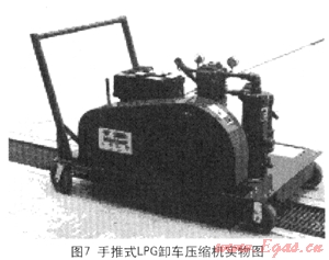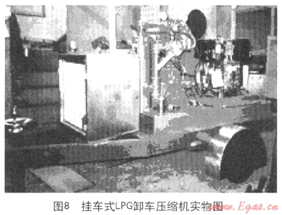 圖7手推式LPG卸車壓縮機(jī)可以實(shí)現(xiàn)在小片區(qū)域的人工改變位置,從而為小片區(qū)域的多個(gè)卸車點(diǎn)進(jìn)行卸車;圖8為掛車式LPG卸車壓縮機(jī),其中配備了更加齊全的附加設(shè)備,從而實(shí)現(xiàn)了大片區(qū)域的不同地點(diǎn)的卸車需求。目前該種移動(dòng)式應(yīng)急卸車設(shè)備在香港加德士石油公司、香港加德士石油公司、香港殼牌有限公司及汕頭加德士海洋燃?xì)庥邢薰九鋫涫褂茫瑧?yīng)該算作是用于搶險(xiǎn)卸車的雛形狀態(tài)。