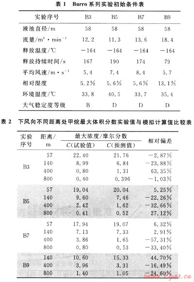 本文研究的數學模型通過Burro系列實驗[1,5]進行驗證,Burro實驗在距離泄漏源下風向57m、140m、400m、800m處分別測得天然氣的最大體積分數值,該實驗共進行了多組,本文對其中的3號、5號、7號和9號實驗進行模擬,將實驗數據與模型計算結果對比,并進行誤差分析,得出模型計算的平均相對偏差為24.28%。實驗的初始條件以及對比結果見表1、2。