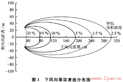 在LNG場站選址時,需要遠離居民區,以保證人民生命財產安全,因此,場站與居民區之間的距離是重要的考慮因素。LNG在泄漏過程中,自泄漏源開始,氣體濃度逐漸被稀釋,當其體積濃度在5%~15%范圍內(即甲烷的爆炸極限內),存在發生火災或者爆炸的可能性。為了確保間隔距離劃定的可靠性,相關標準(如NFPA59A),規定其下風向體積濃度為2.5%處的距離為安全距離[4]。以Burro系列5號實驗為例(以下簡稱B5),其下風向上體積濃度的等濃度線見圖1,可以看出下風向體積濃度5%和2.5%的最大距離差約為110m。以下用所建的計算模型,對氣體擴散過程和安全距離的影響因素進行分析。