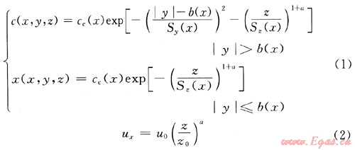 連續泄漏模型又稱穩態模型,即下風向云團內部的各種性質參數只是位置的函數。DEGADIS作為積分模型,假設氣體擴散濃度在側風向上采用修正的高斯分布,而豎直方向上采用指數分布,并且對風速分布做了假設,其表達式如下: