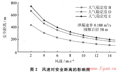 所建立的LNG泄漏氣體擴散模型計算方法,經過實驗驗證,其平均偏差為24.28%,并較準確地體現了重氣擴散過程中云團內部特性的變化規律。對于穩態LNG氣體擴散,當風速大于2m/s時,隨著風速的增加,安全距離是逐漸減小的;對于較小風速(小于2m/s)時,該穩態模型將不再適用。泄漏速率增大使安全距離幾乎成比例增大,是影響安全距離最重要因素之一。對于給定的LNG泄漏率,圍堰尺寸變化對安全距離的影響會呈現出一個弱峰,之后安全距離會隨圍堰尺寸的增加而略有減小。