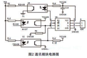 本機有時需外接工控機進行精準測量,所以本機留有RS485接口用于通訊。考慮到通訊可靠和操作員的安全,本機通訊接口采用了光電隔離。通訊模塊電路布置如圖2。